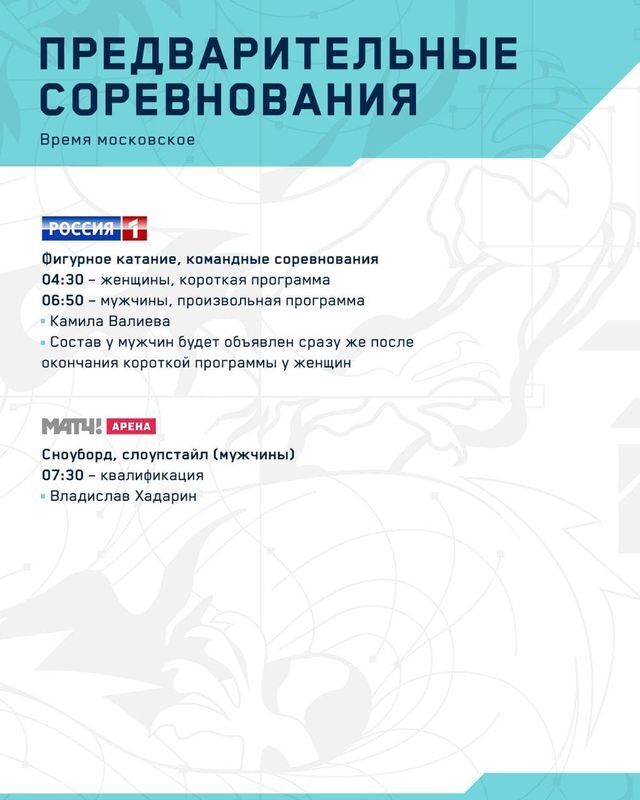 06:50. Телеканал «Россия 1». Фигурное катание, командные соревнования. Мужчины, произвольная программа. Состав у мужчин будет объявлен сразу же после окончания короткой программы у женщин.