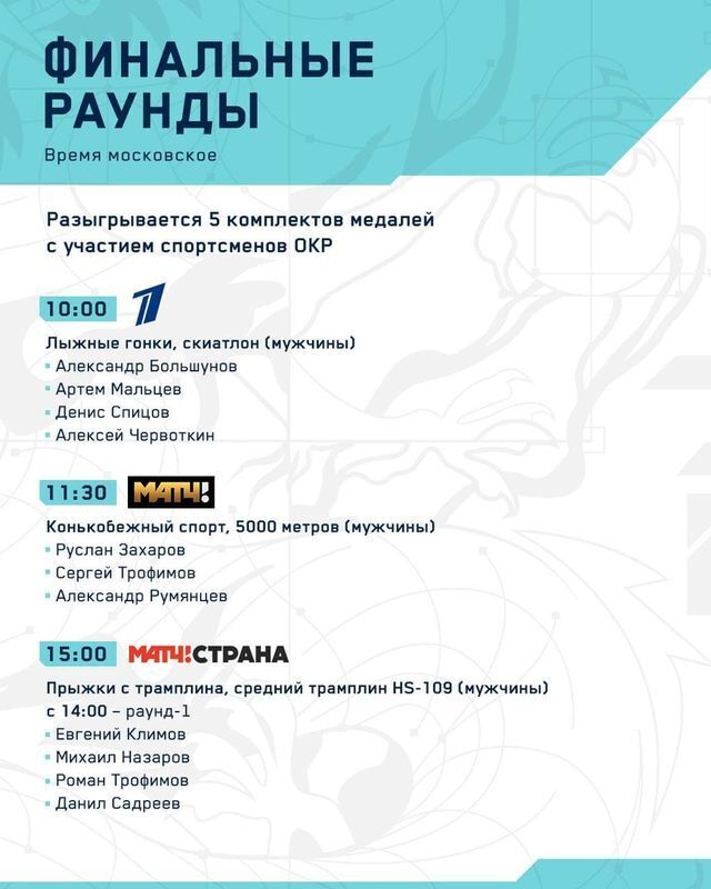 16:15 «Матч! Игра». Санный спорт, сани-одиночки (мужчины). С 14:30 — третий и четвертый заезды. Роман Репилов, Семен Павличенко, Александр Горбацевич.