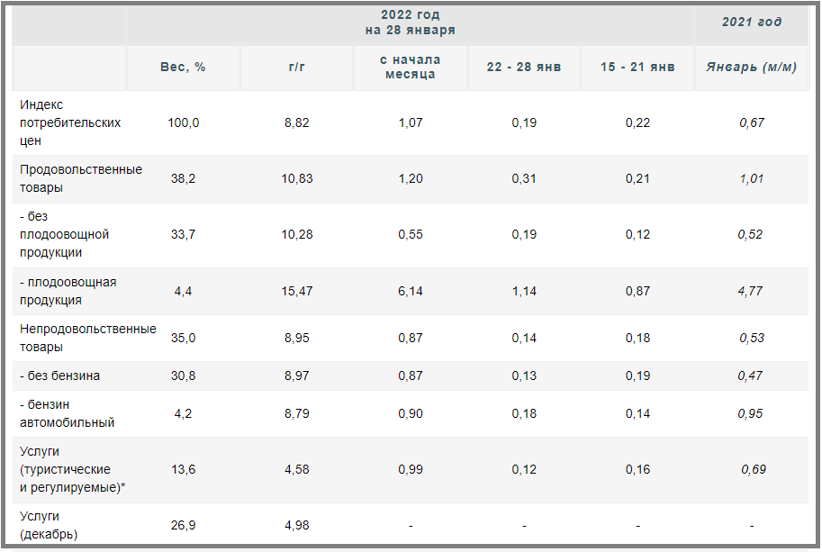Инфляция в России за январь 2022 года ускорилась до 8,82% в годовом выражении