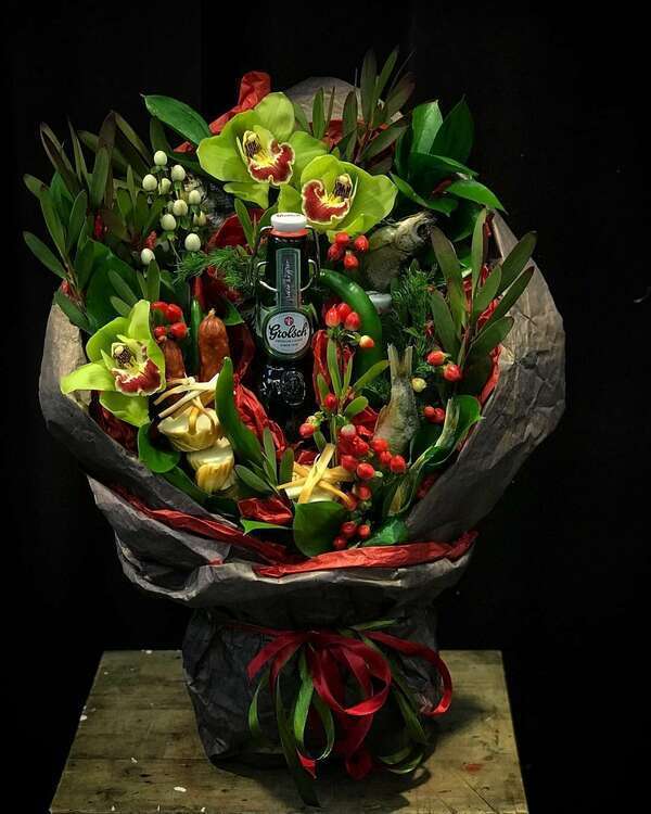 Ну посудите сами, цветы я Вам подарить не мог, не юбилей не день рождения не свадьба, да и на этих мероприятиях, цветы всё же женщинам дарят, а вот необычный букет с мужским набором продуктов, надеялся Вас заинтересует...)))?!