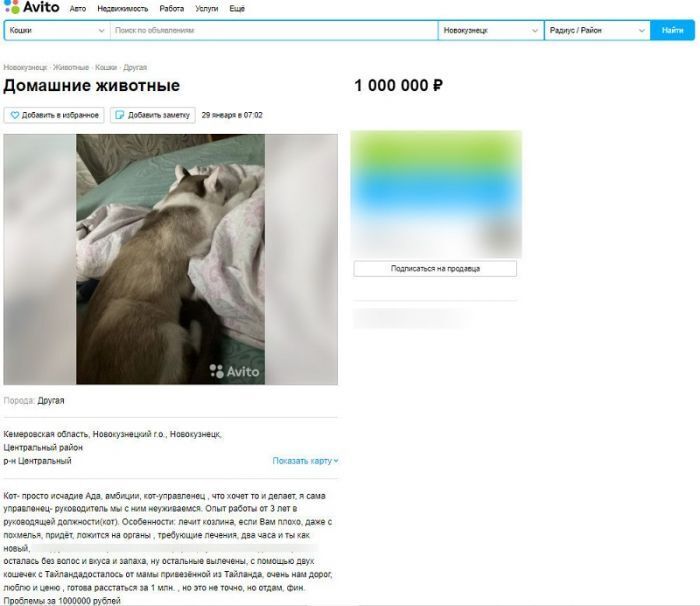 Женщина готова отдать "высококвалифицированного" домашнего любимца за 1 миллион рублей.