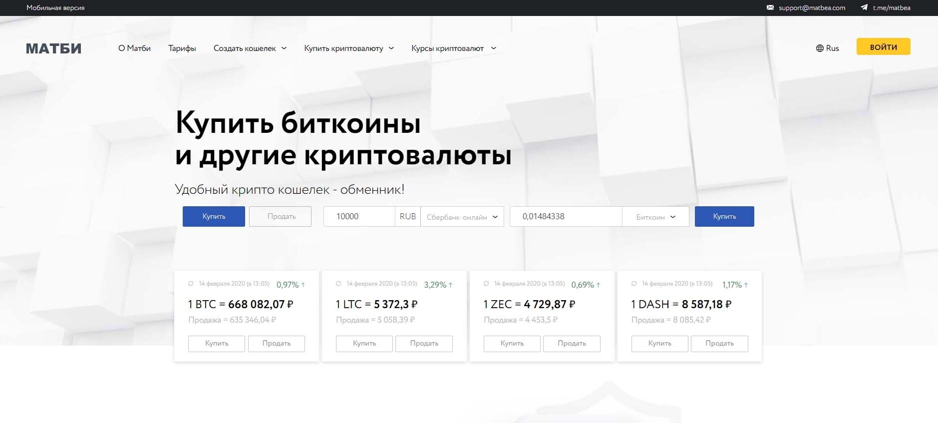 «Матби» — это криптокошелек и обменник на одном сайте. Он очень удобен для тех, кто желает купить или продать биткоины за российский рубль. Можно платить через банк, кредитную карту, систему «Киви» и другими способами. Используется трехфакторная аутентификация:
