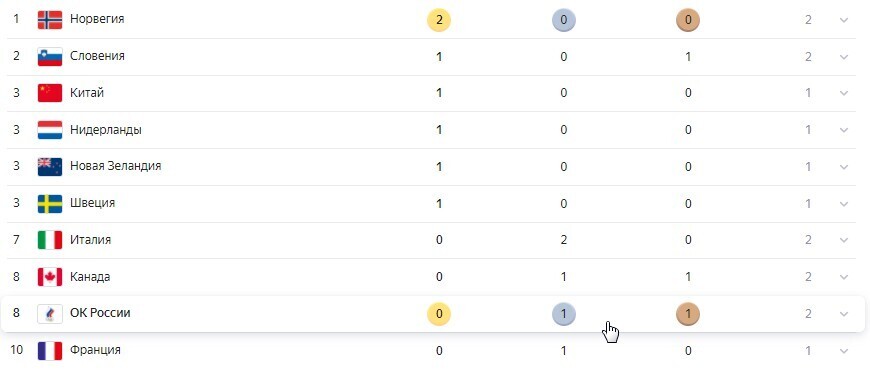 Как видите, Россия сейчас занимает 8 место, деля его с Канадой. Поздравляем наших медалистов и верим, что скоро мы поднимемся в таблице намного выше!