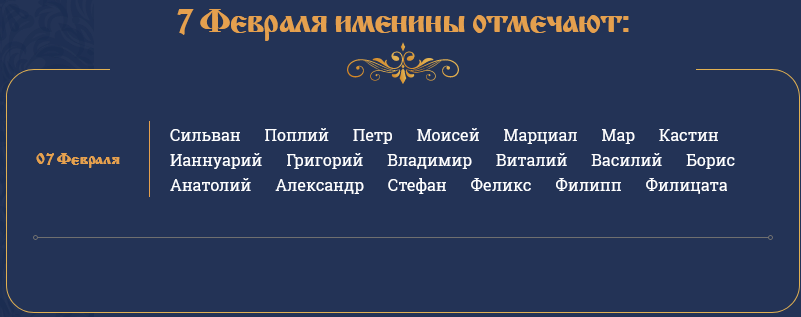 По церковному православному календарю 7 Февраля, отмечается всего 19 именины: 18 мужских и 1 женских. Список именин поможет в выборе имени для мальчика или девочки, рожденных в этот день.