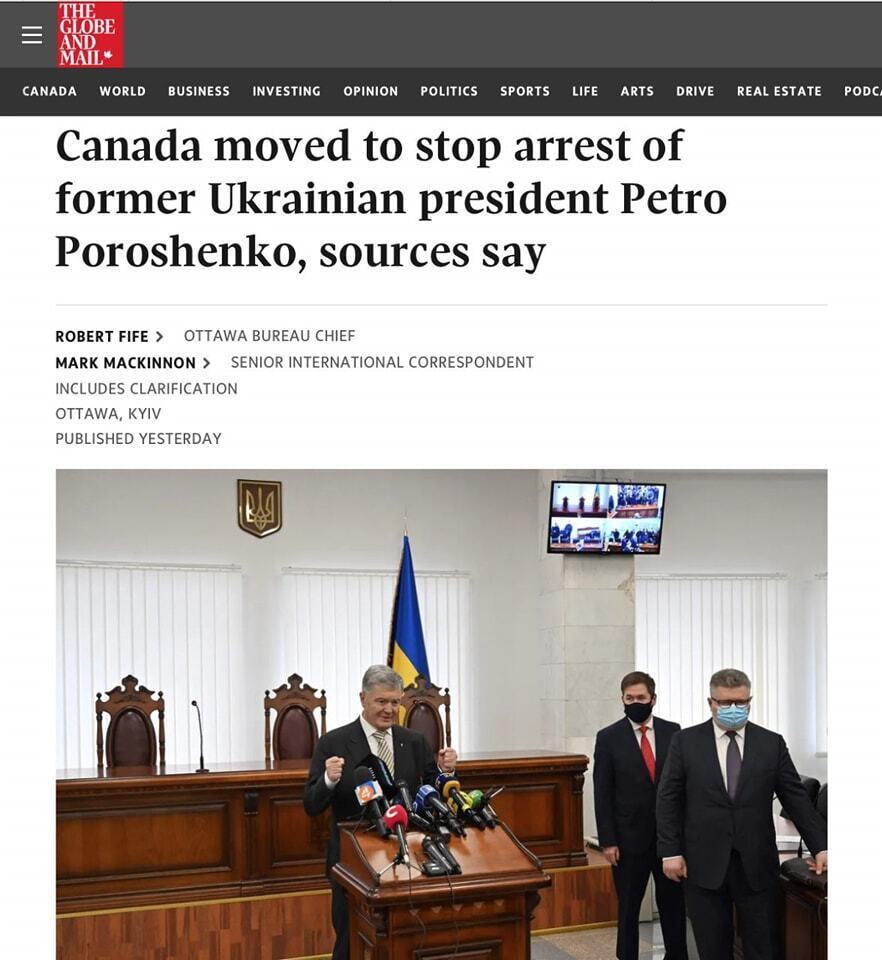Немного о независимости. Канадская ежедневная газета the Global and Mail вышла с заголовком "Канада приняла решение прекратить арест бывшего президента Украины Петра Порошенко".