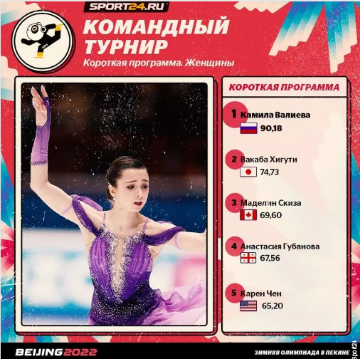 На эту 15-летнюю хрупкую девочку легла огромная ответственность и надежда, ведь именно она могла помочь команде, сражающейся за нашу страну, вырваться вперед в гонке за первыми золотыми медалями в фигурном катании на Олимпиаде-2022. Идеальный прокат — тройной аксель, тройной флип, каскад лутц-тулуп. Уверенное первое место, чуть не дотягивает до мирового рекорда — 90,18 балла. Прокат Камилы впечатлил всех. Иностранцы оценили ее выступление.
