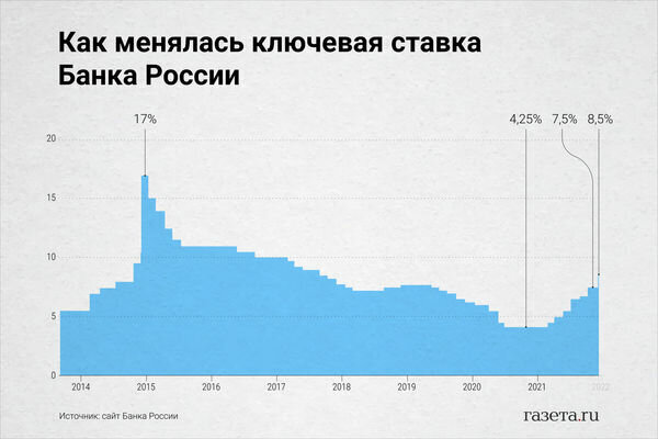 Главными причинами, по которым может увеличиться ключевая ставка, стали рост цен на 8,82% в начале 2022 года (данные Росстата), риск дальнейшего роста цен и высокие инфляционные ожидания населения из-за сложной геополитической ситуации.