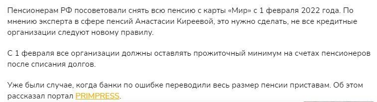 Ряд СМИ опубликовали новости, гласящие о том, что российским пенсионерам рекомендуют с 1 февраля 2022 года снимать всю пенсию с карты "Мир".