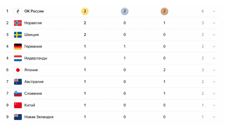 На втором месте идет Норвегия (2-0-1), на третьем Швеция (2-0-0).