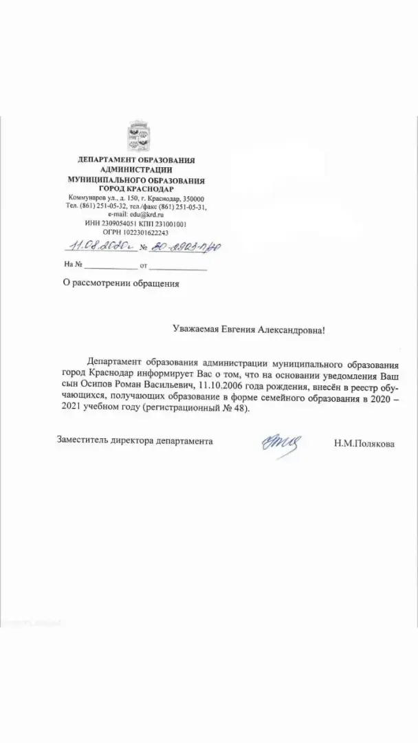 🚩Буквально только что мне пришел ответ из Краснодарского Департамента образования о том, что Рому внесли в реестр, обучающихся на СО.