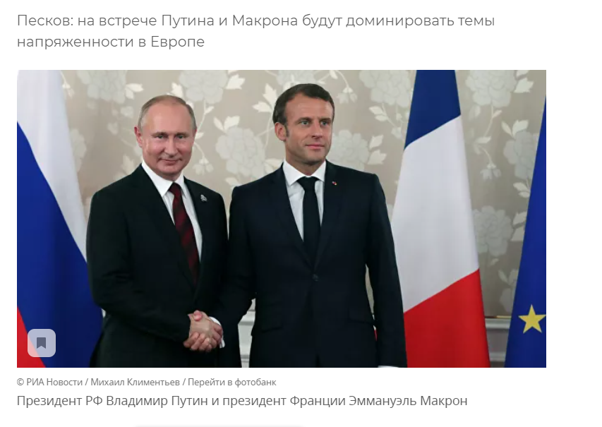 Главной темой встречи президентов России и Франции Владимира Путина и Эммануэля Макрона станет напряженность в Европе, заявил пресс-секретарь российского лидера Дмитрий Песков.