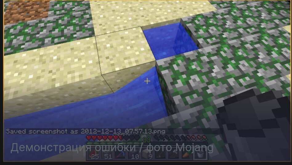 Информацией об ошибке поделился портал PCGamesN. Она заключалась в поведении воды при размещении в пустую ячейку, рядом с которой по диагонали находилось свободное пространство. Туда перетекала жидкость, но под очень странным углом. Возникал визуальный баг в отображении воды, к которому аудитория уже успела привыкнуть. Его обнаружили еще десять лет назад, но Mojang Studios не спешила с исправлением.