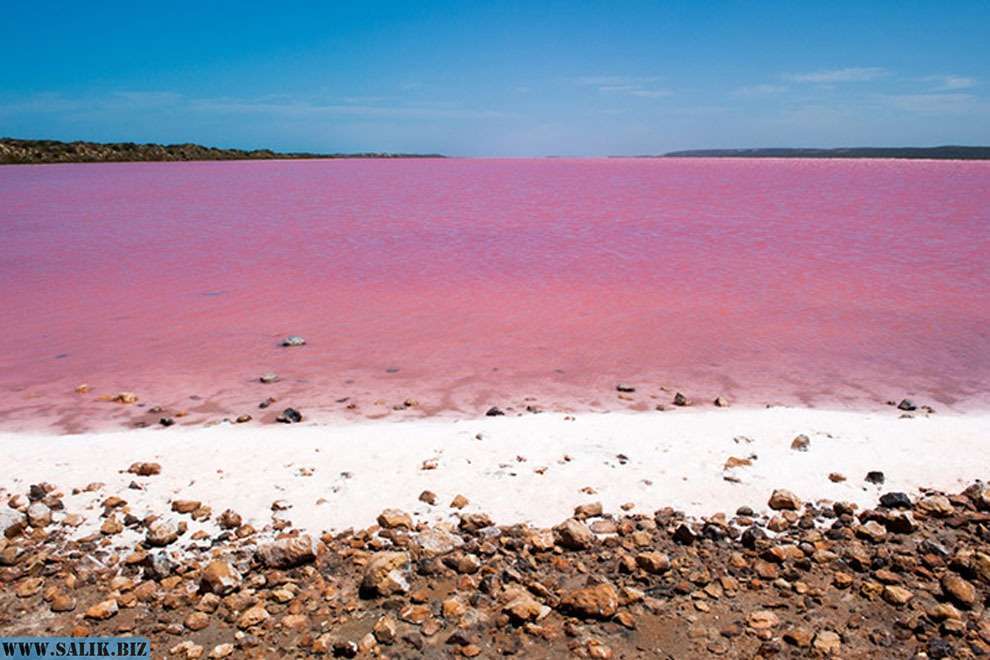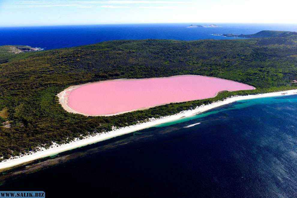 Озеро Хиллиер расположено на Срединном острове в архипелаге Речерч на юго-западе Австралии. Со всех сторон водоём окружают высокие вечнозелёные эвкалипты, которые резко контрастируют с розовой водой озера. Лишь узкая полоса земли, состоящая в основном из песчаных дюн, отделяет эту красоту от океана.