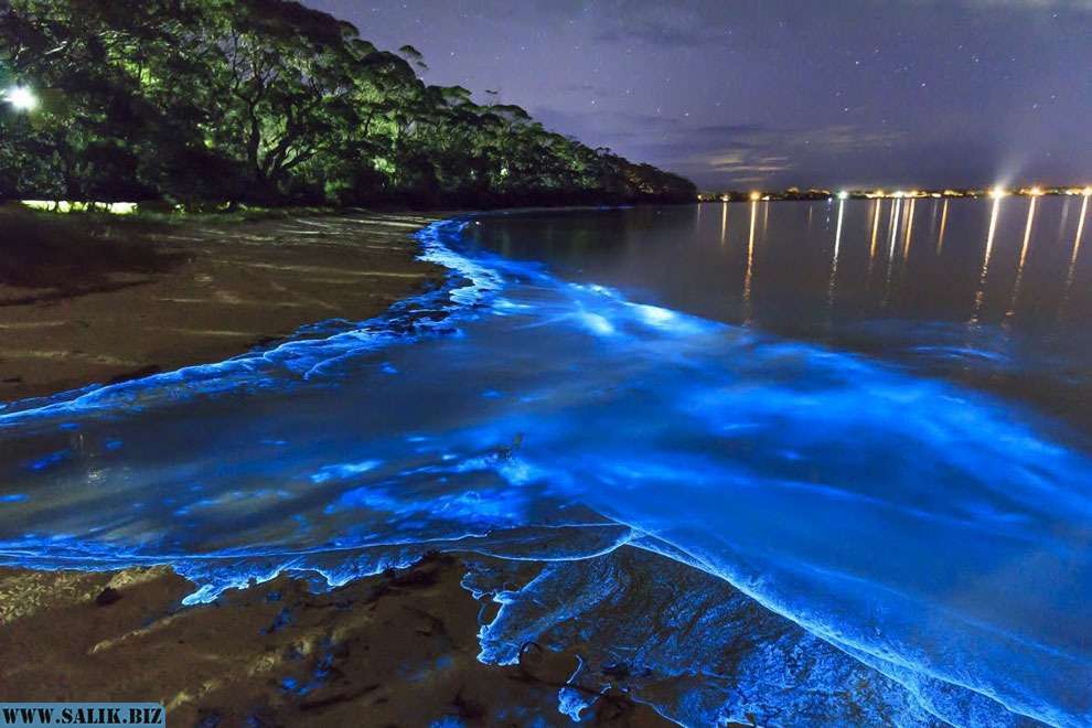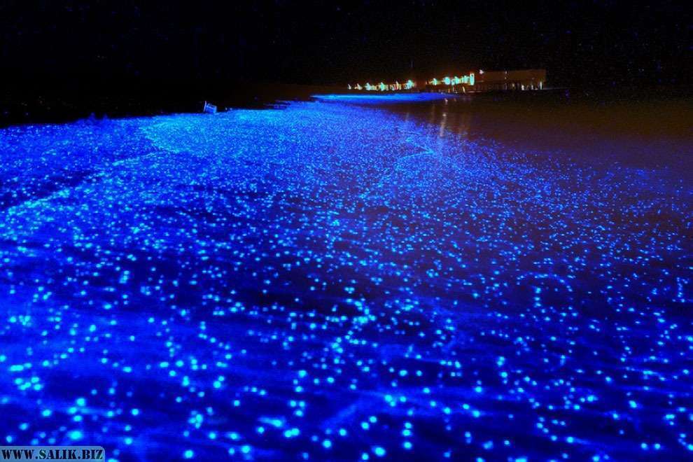 Когда наступает вечер, воды и пляж у побережья Ваадаху (Мальдивские острова) начинают переливаться таинственным мерцающим светом. Это уникальное природное явление вызвано микроскопическими организмами — биолюминесцентным фитопланктоном. Микроорганизмы, выброшенные на берег, излучают свет в состоянии стресса, поэтому под воздействием волны ночью весь берег окрашивается в мерцающий синий и ярко-бирюзовый цвета.
