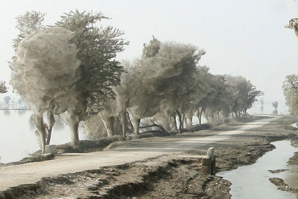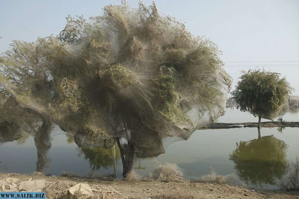 Необычное явление произошло в некоторых районах Пакистана после наводнения 2010 года. Миллионы пауков поднялись на деревья, чтобы избежать паводковых вод, возникших из-за наводнения. Окутывая деревья своими шелковыми волокнами, они превратили многие из них в настоящие коконы.