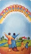 Карта Таро 10 Кубков символизирует безоблачное и всепоглощающее счастье в семье. Причём 10 Кубков Таро не обязательно связана с законным браком. Имеется в виду единение душ, желание оградить, позаботиться и поделиться теплом. Карта символизирует взаимные эмоции, доброту и привязанность, гармоничный и долгосрочный союз с подходящим и понимающим человеком.