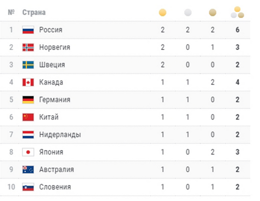 Благодаря победе фигуристов сборная России вырвалась в лидеры общего командного зачета. Сейчас в копилке россиян 2 золотых, 2 серебряных и 2 бронзовых медали.