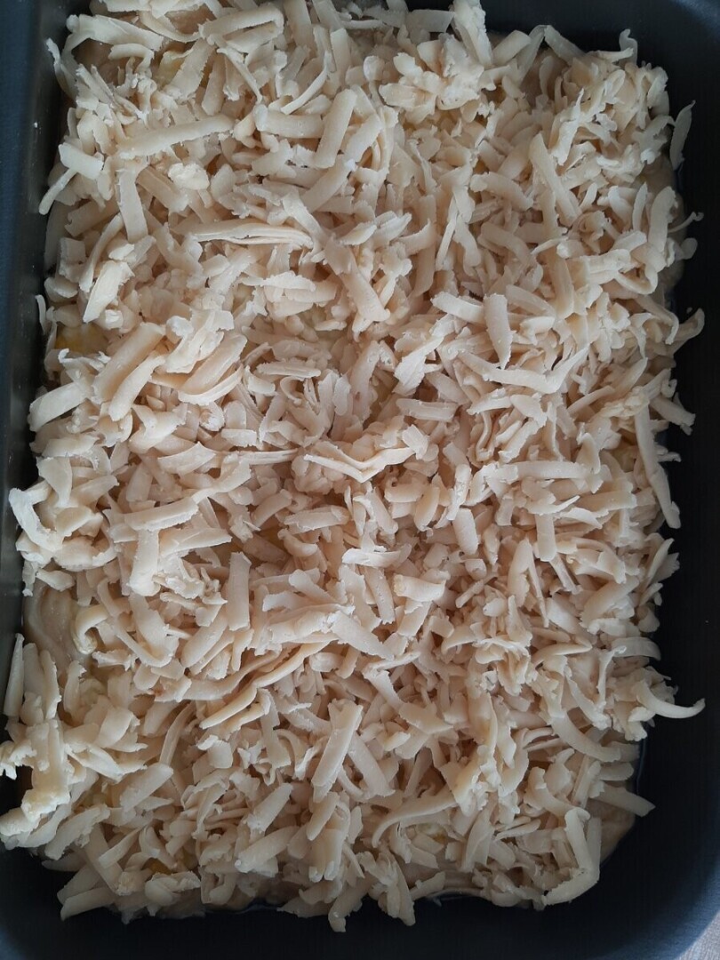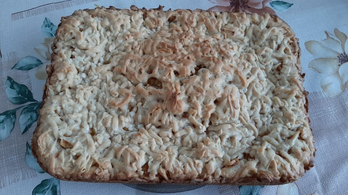 9) Замороженное тесто натираем на крупной терке сверху нашей заготовки, распределяя равномерно по всей поверхности.