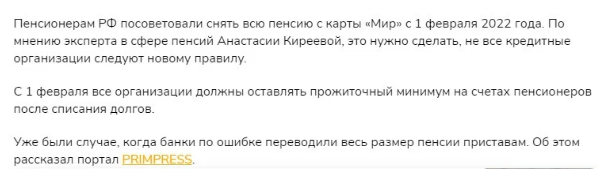Однако, эта рекомендация абсолютно бесполезна. Дело в том, что если на счет наложен арест, и с него производится списание, оно произойдет автоматически сразу же, как только туда поступит пенсия. Пенсионер просто не успеет воспользоваться советом госп. Киреевой, как бы он этого ни хотел. Средства будут списаны сразу же, в нужном объеме или ошибочном - это уж я не знаю.