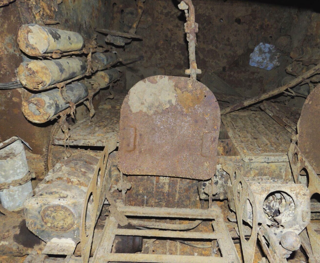 При тщательном изучении танка было обнаружено несколько снарядов, консервы, гаечные ключи, радиостанция и противогазы.
