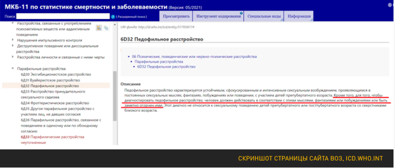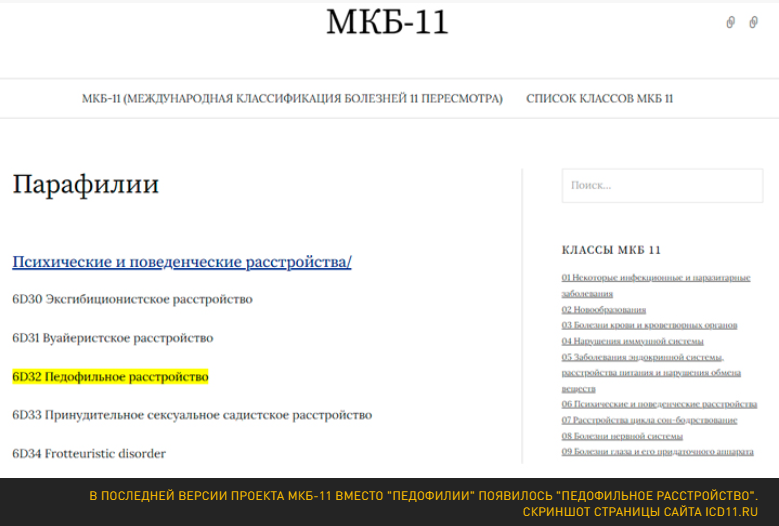 Причём если в МКБ-10 педофилия расшифровывалась как просто "Сексуальное предпочтение детей, мальчиков или девочек или обоих, обычно в препубертатном или раннем пубертатном возрасте", то "педофильное расстройство", по мнению составителей МКБ-11, должно диагностироваться лишь в том случае, если – внимание! – человек сначала как минимум попытался реализовать свои "мысли, фантазии или побуждения", либо "заметно огорчён ими".
