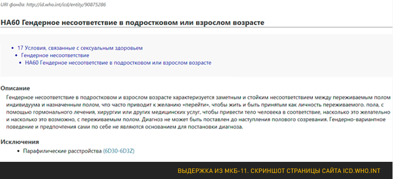 Если в предыдущей версии (МКБ-10) присутствовал параграф "Расстройство половой идентификации" (F64), включавший в себя подраздел "Транссексуализм", то в проекте МКБ-11 его заменило расплывчатое понятие "Гендерное несоответствие". Причём из главы "Психические и поведенческие расстройства" его перенесли в "Нарушения сексуальной сферы". Из этого можно сделать вывод, что трансгендерность более не рассматривается как психическое расстройство, а является "условием, связанным с сексуальным здоровьем". Видимо, как одна из его "форм", не иначе.