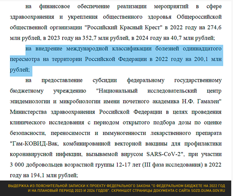 ВНИМАНИЕ! С 1 января наступившего года в России началось внедрение Международной классификации болезней 11-го пересмотра (МКБ-11), разработанного Всемирной организацией здравоохранения. На этот процесс, который займёт три года, только в текущем 2022-м будет выделено 200,1 млн бюджетных рублей – несколько меньше, чем на "Красный крест", но больше, чем на тестирование вакцины для подростков.