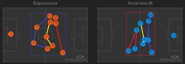 На карте усредненных позиций игроков хорошо видно, как Барса перегружала левый фланг атаки и оставляла в изоляции Траоре. У Атлетико бросается в глаза позиция Карраско (№21), который начинал матч правым нападающим при структуре 4-3-3. Его наличие на левом фланге связано с последующими тактическими перестановками гостей. Большую часть игрового времени бельгиец провел на левой бровке.
