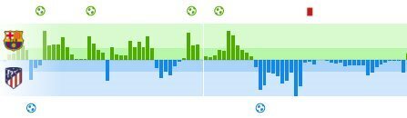 В общем, у Атлетико очень хорошая статистика, но это как раз тот случай, когда она не отображает в полной мере реального положения дел. Соотношение ударов и других показателей начало выравниваться лишь после того, как счет в матче стал 4:1 в пользу Барсы. К примеру, на отрезке между голом Алвеса и до конца матча соотношение ударов составляло 1:6! Атлетико короткими отрезками перехватывал инициативу, но в целом, даже после удаления Барселона контролировала игру.