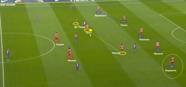 У Атлетико тройку в центре поля составили Де Пауль, Коке и Лемар. Карраско и Фелиш в основном действовали выше, в полуфлангах.