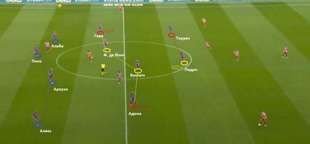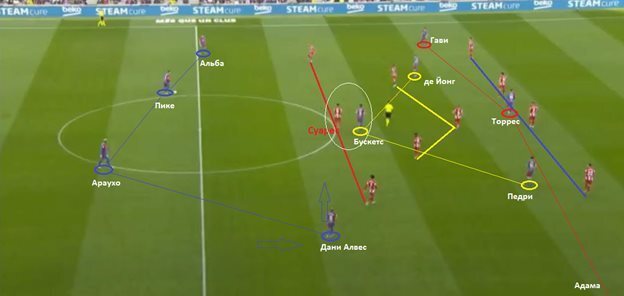 В процессе развития атак Альба поднимался по бровке, создавая ширину слева. Его страховал де Йонг, который, как правило, действовал глубже в полуфланге. Ферран Торрес часто смещался ближе к Гави. Перегруз фланга заставлял Атлетико стягивать большие силы к зоне мяча, что автоматически улучшало условия для изоляции Траоре на дальней бровке. В центре поля диспетчерскими функциями отличались Бускетс и Алвес. По сути, последний играл ложного фулбека.