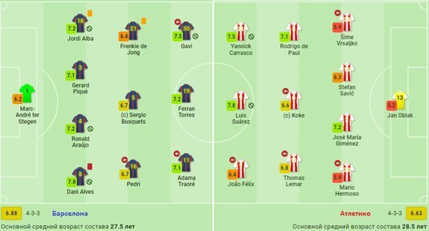 Барселона: тер Штеген — Дани Алвес, Пике, Араухо, Альба — Ф. де Йонг, Бускетс, Педри (Нико, 66) — Гави (Дест, 71), Ферран, Адама (Обамеянг, 61).
