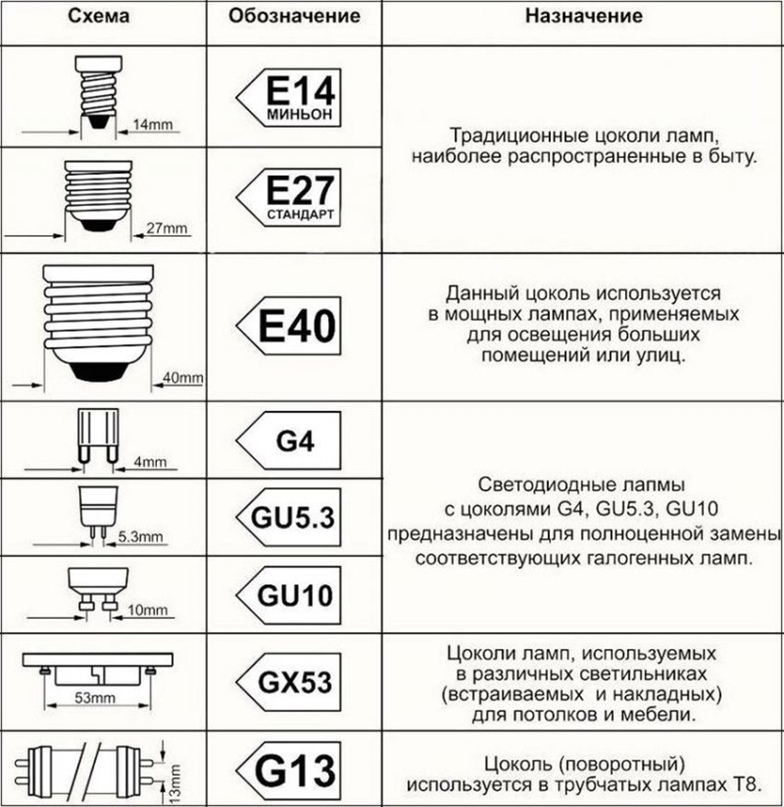 Первый по популярности — винтовой цоколь Е 27, 27 мм в диаметре. На втором месте — винтовой цоколь Е 14, его диаметр — 14 мм. Цоколь GU 5,3 встречается как у ламп 220V, так и 12V, чаще всего у галогеновых, софитных либо у светодиодных. Цоколь GU 10 обычно бывает у галогеновых зеркальных или светодиодных ламп с напряжением 220V. Цоколь GX53 подходит для светильников GX — плоских и крупных, а ещё для освещения натяжных потолков.