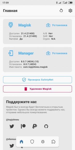5. Установите приложение для разблокировки root. Самое продвинутое и популярное — Magisk. Оно подходит для устройств с Android 5.0 и новее. Найдите руководство по установке Magisk в теме по вашему девайсу на 4PDA. В большинстве случаев оно сводится к тому, чтобы загрузить Magisk отсюда. Поместите ZIP‑архив в память смартфона и установите его через TWRP. Перезагрузитесь и установите Magisk Manager, который позволяет управлять правами root через удобный графический интерфейс.