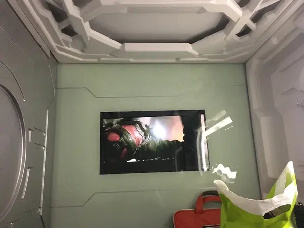 Внутри капсулы удобств не так уж и много, но они есть. Есть розетка и USB порт для зарядки. Пуль управления самой капсулой. Есть вентиляция и встроенный кондиционер, который дует очень холодным воздухом. Поэтому обязательно нужно чем-то укрываться, иначе вы простудитесь. Также есть мини сейф (хотя я так и не поняла, зачем он нужен), зеркало.