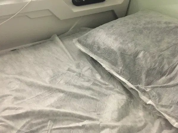 Внутри лежит матрац, похожий на школьный мат в спортивном зале, на котором мы отрабатывали кувырки. Он достаточно жёсткий. К нему вам выдают одноразовую простынь. Также есть две подушки, но наволочки на них уже были надеты. Пришлось поверить сотруднику, что они чистые, и никто до меня на них не спал... И это всё.