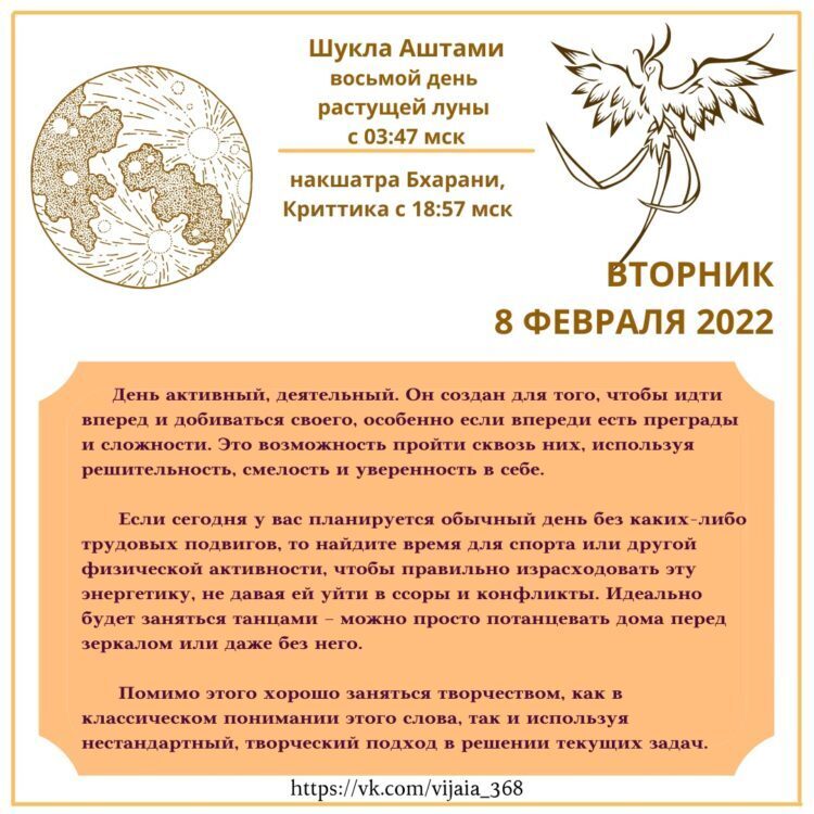 8 февраля 2022 года, вторник 8 л.с. с 03:47 мск, накшатра Бхарани, Криттика с 18:57 мскЛуна в Овне