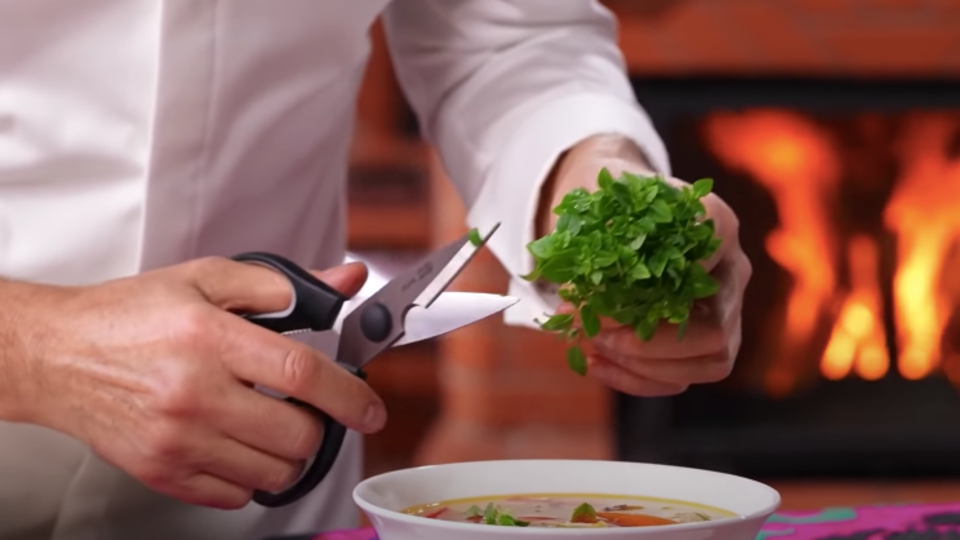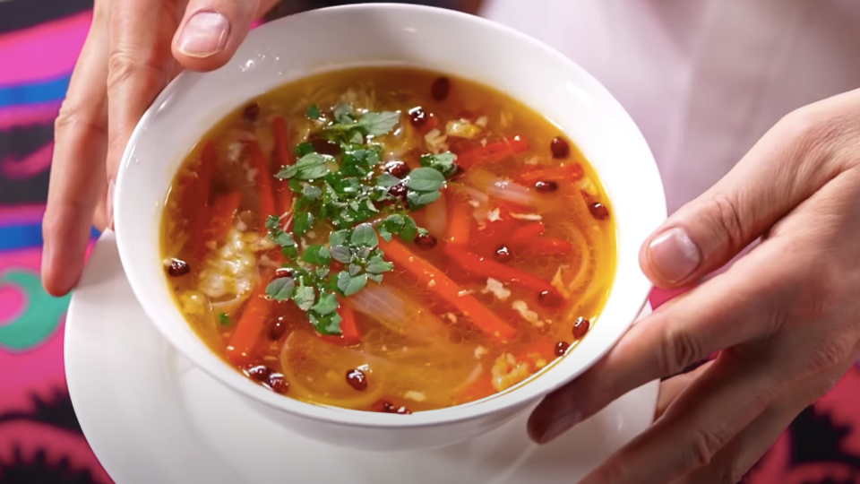К этому красивому супу не хватает только микробазилика. В итоге узбекское блюдо получается очень красивым – золотистый бульон, белый лук, желтая морковь, красный перец и зеленый микробазилик.