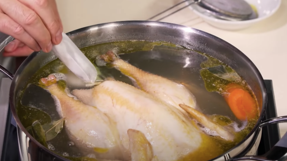 После того, как поставили курицу вариться, необходимо сразу ее посолить. Кулинар рекомендует брать одну столовую ложку соли на четыре литра воды. Чтобы бульон получился идеально чистым, следует снимать с него пену.