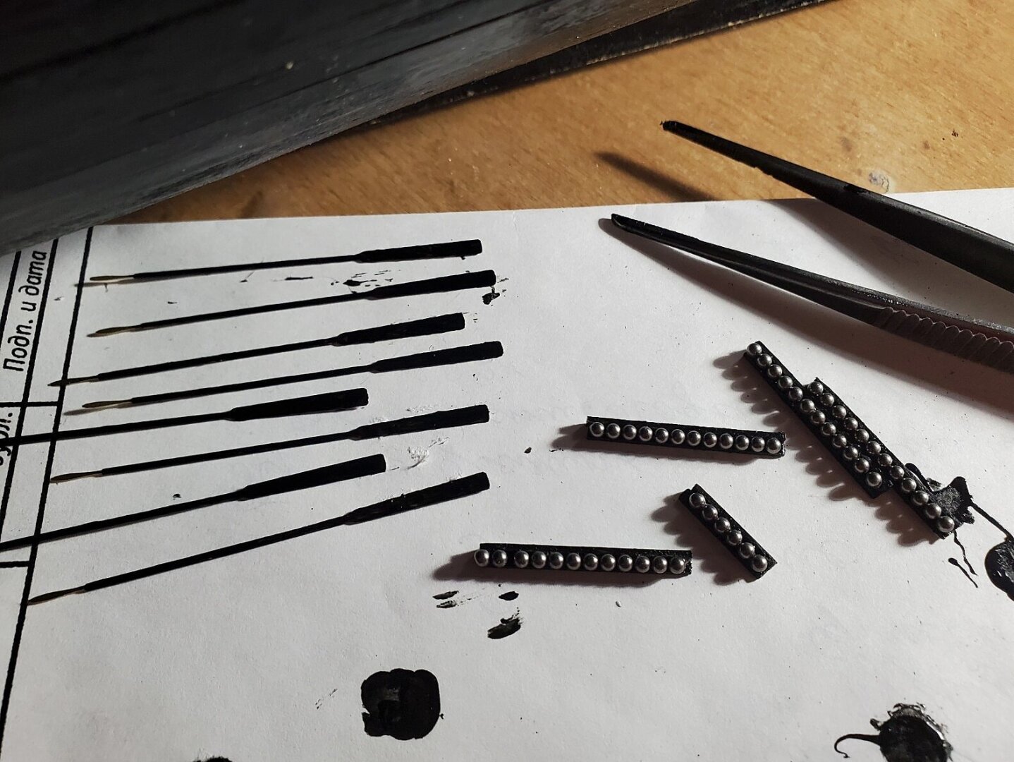 Весла сделаны из дуба, окрашиваю черной матовой краской, ядра приклеиваю столярным клеем.