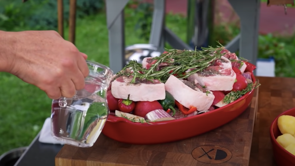 После этого для будущего пара и бульона рекомендуется подлить немного воды (100-150 г) прямо в форму для запекания.