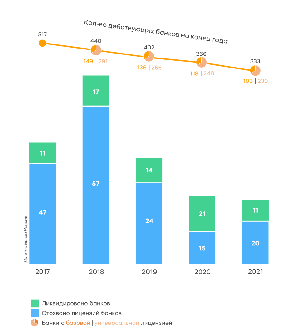 Итого на 1 января 2022 года в России оставалось 333 действующих банка и 35 НКО. 230 банков располагали универсальной лицензией, еще 103 — базовой, предполагающей упрощенные требования к раскрытию информации и предоставлению отчетности.
