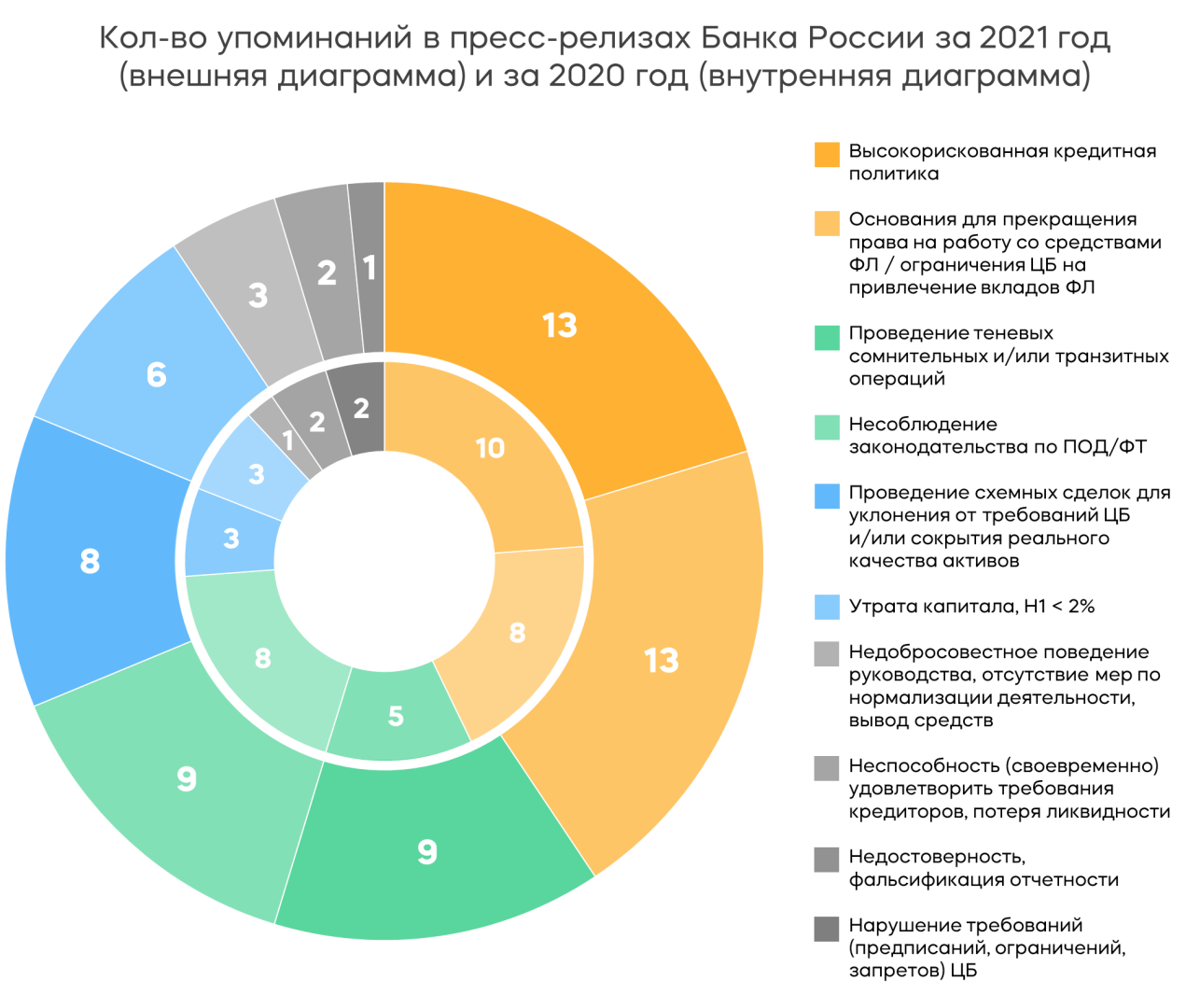 Тройка самых распространенных причин отзыва банковских лицензий с 2020 года почти не изменилась. Основной причиной отзывов банковских лицензий традиционно остается неадекватная оценка активов и недостаточное резервирование, упоминаемые в 13 пресс-релизах ЦБ об отзывах банковских лицензий в прошедшем году.