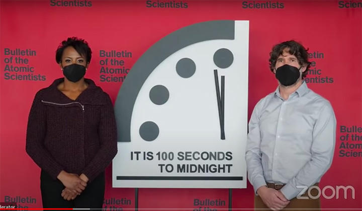 В 2022 году напряженность в отношениях между США, Россией и Китаем сохранится, а изощренность ядерного оружия, разработка нового ядерного оружия в Иране и запуск северокорейских ракет будут угрожать человечеству. В дополнение к ядерной проблеме появление новых мутантных штаммов в развивающихся странах до распространения новой вакцины против коронавируса и задержка с реагированием на изменение климата также поддерживают «100 секунд, оставшихся до полуночи».