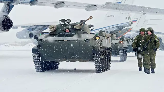 Российские военнослужащие из миротворческого контингента ОДКБ во время выгрузки из самолета военно-транспортной авиации ВКС РФ на аэродроме Иваново-Северный