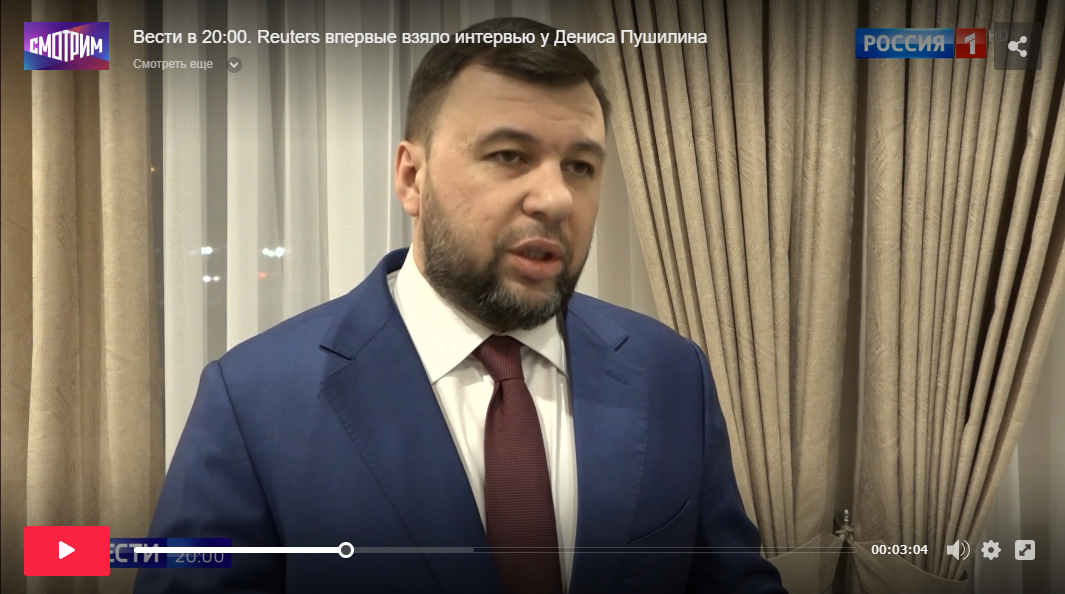 Агентство Reuters, работающее по всему миру, опубликовало интервью с Денисом Пушилиным, как говорится в тексте, "лидером сепаратистов, поддерживаемых Россией".