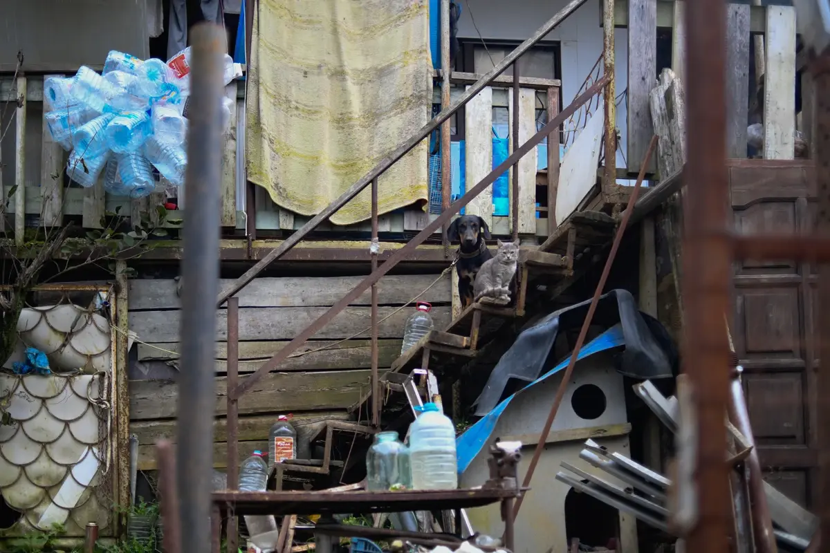 Чтобы спуститься к разрушенным оползнем домам, нужно преодолеть целую полосу препятствий. Обходим овраг, продираясь через лесные заросли. Временами почва уплывает из-под ног. Разрушенный поселок вблизи выглядит жутко. Асфальт и подпорные стены около домов покорежены, заборы из профнастила смяты, словно фольга. Белоснежные домики наклонены под разными углами, а некоторые сорваны с фундамента и стоят на одном ребре. Там, где раньше была аккуратная улица, кусками лежит бетон, они опасно пошатываются, когда на них наступаешь. Кругом брошенные в спешке вещи, обломки досок, вывернутые из земли трубы, оборванные провода…