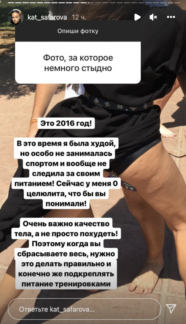 «В это время я была худой, но особо не занималась спортом и вообще не следила за своим питанием! Сейчас у меня ноль целлюлита, чтобы вы понимали!» – написала Сафарова своим подписчикам.