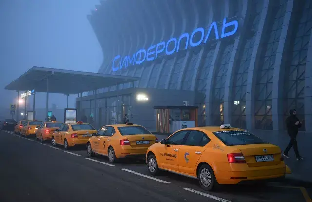Автомобили такси на территории международного аэропорта Симферополь имени И. К. Айвазовского во время тумана