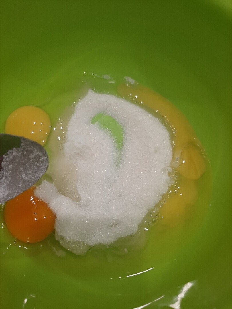 3. Пока растапливается масло, смешайте сахар, ванилин и 3 яйца в глубокой миске.